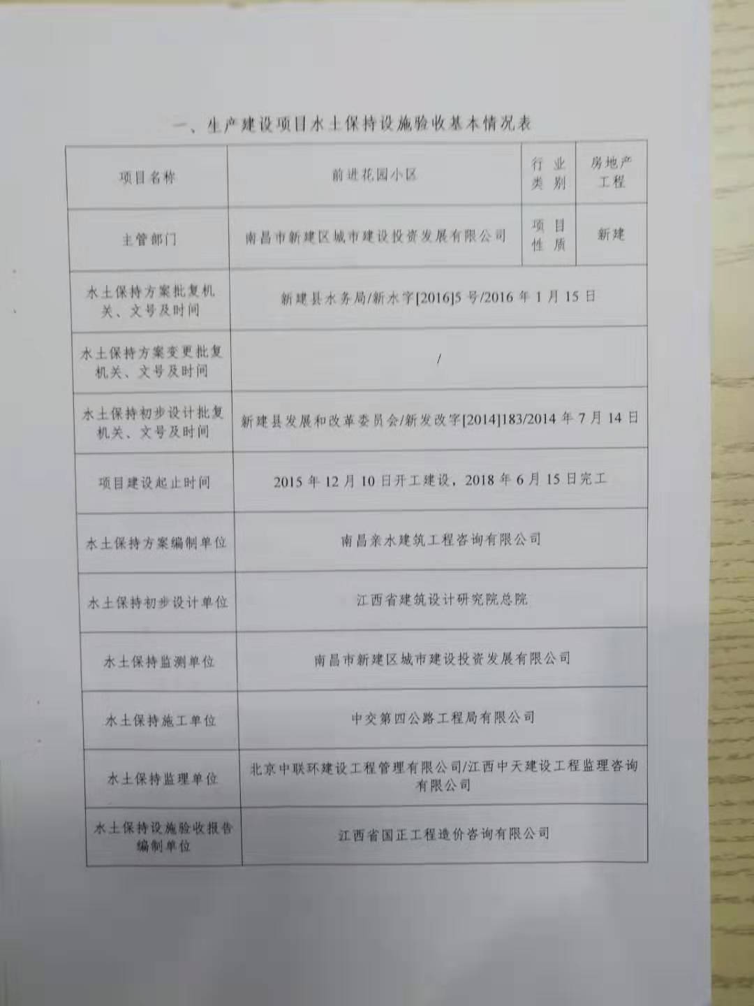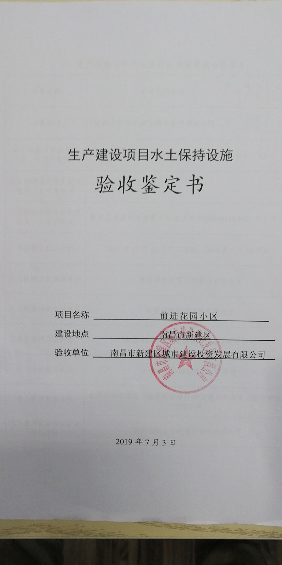 根据《水利部关于加强事中事后监管规范生产建设项目水土保持设施自主验收的通知》(水保[2017]365 号),南昌市新建区城市建设投资发展有限公司于2019年07月11日在新建区主持召开了前进花园小区项目水土保持设施验收会议,参加验收会议的有建设单位兼水土保持监测单位南昌市新建区城市建设投资发展有限公司、水土保持方案编制单位南昌亲水建筑工程咨询有限公司、水土保持监理单位北京中联环建设工程管理有限公司、江西中天建设工程监理有限公司和施工单位中交第四公路工程局有限公司,会议成立了评审组(名单附后)。