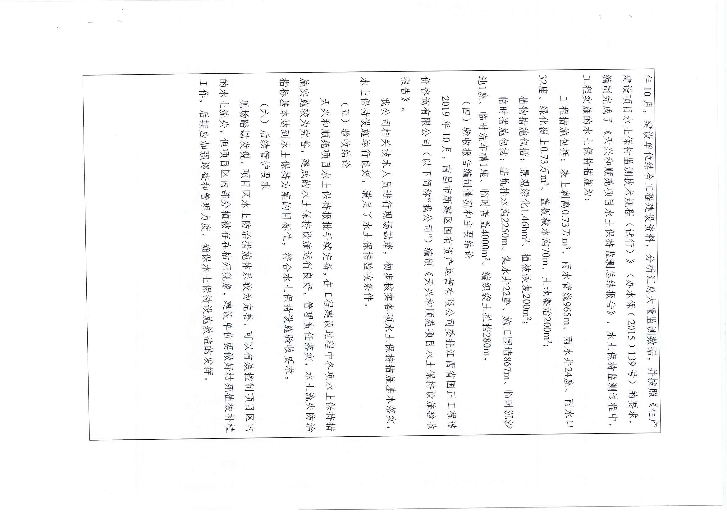根据《水利部关于加强事中事后监管规范生产建设项目水土保持设施自主验收的通知》(水保[2017]365 号),2019年11月08日,南昌市新建区国有资产运营有限公司主持召开了《天兴和顺苑项目》水土保持设施验收会议。参加验收会议的有江西省一建筑工程公司、江西省国正工程造价咨询有限公司、江西省赣建工程建设监理有限公司、江西省国正联工程技术咨询有限公司等单位的代表,会议成立了验收组(名单附后)。